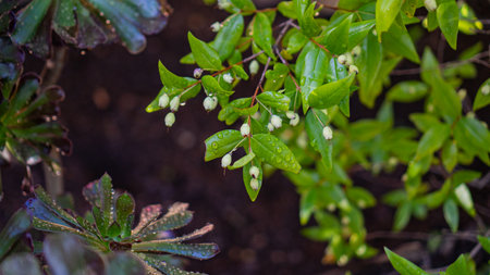White myrtle branch with green berries and shiny leaves in natural sunlight