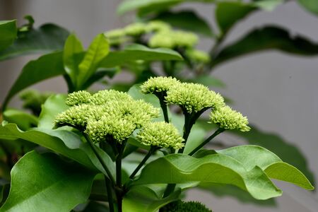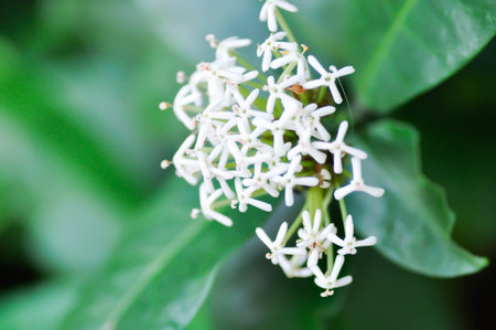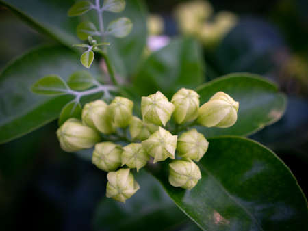 The flowers of the murraya paniculata are blooming.Green flowers background