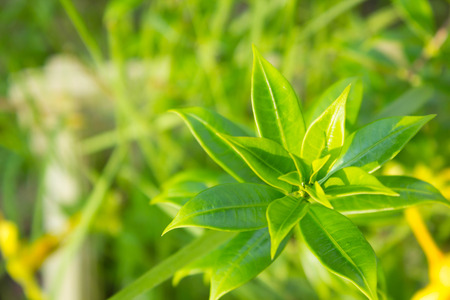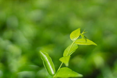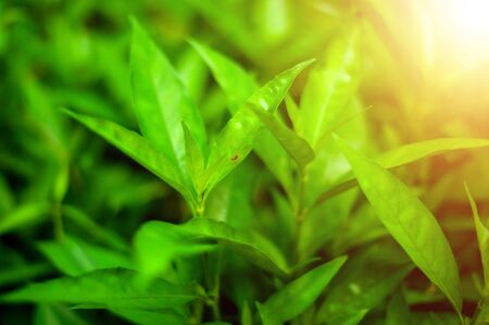 Closeup nature view of Green leaf in garden at summer under sunlight. Natural green plants landscape using as a background or wallpaper.