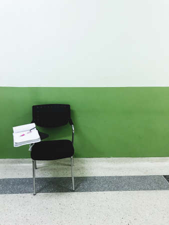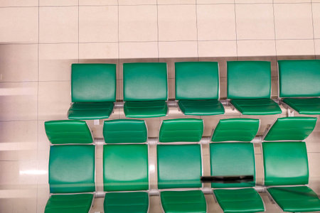 Row of Green Plastic Chairs in Empty Waiting Area with Metal Wall