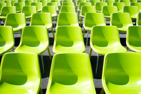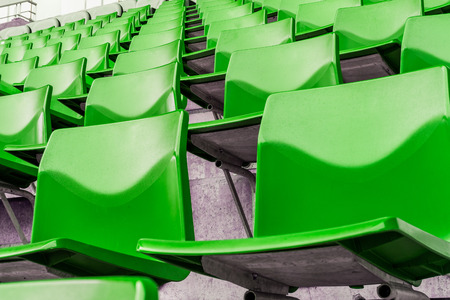 green plastic stadium seats arranged in a row. The image has been made before the beginning of a tennis game,