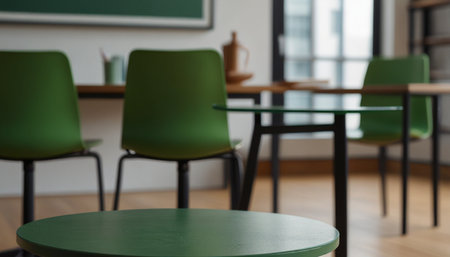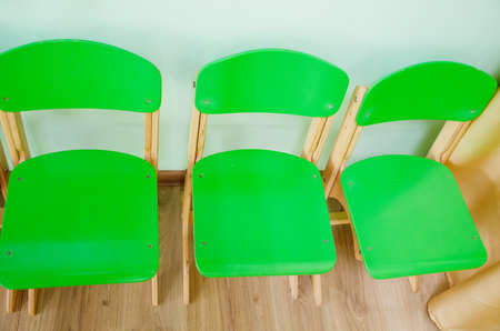 Horizontal photo of a row of empty green chairs in a kindergarten. preschool education concept