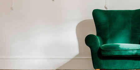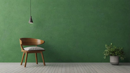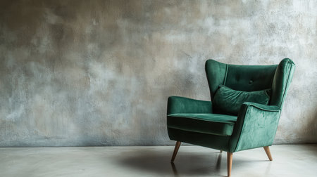 A stylish green armchair is positioned against a textured gray wall in a minimalist space. The chair invites comfort and relaxation, enhancing the room's aesthetic.