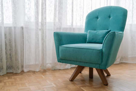 A new and cozy turquoise blue armchair on parquet floor in the living room