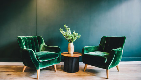 Modern living room with a dark green armchair and a table against a white wall, simple interior design with hanging lamps, close-up of a coffee set on side tables in a minimalist home decor. --ar 3:2 --v 6.1 Job ID: d32d3454-5410-42b2-886c-7ce858b309c6