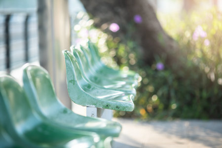 Plastic chairs fixed at bus stop stations with sunlight background. chairs at bus stop.