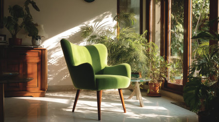 A stylish green chair sits elegantly in a sunlit living room, surrounded by vibrant indoor plants, creating a peaceful and inviting atmosphere.