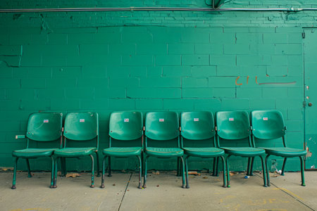 Row of Empty Green Chairs Against a Turquoise Wall in a Minimalistic Urban Setting AI Generative
