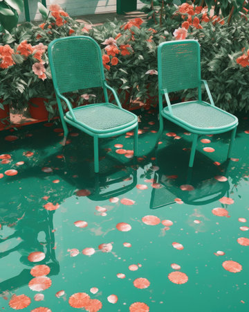 Two chairs and bush of flowers on bright blue water surface. Minimalistic conceptual summer background