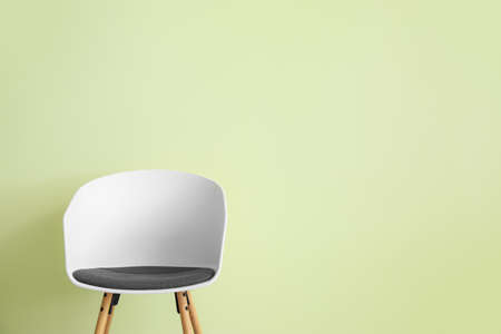 Wooden chair on light wall background with copy space for your text. Style minimalistic concept in trendy mint color. Interior design. Banner.