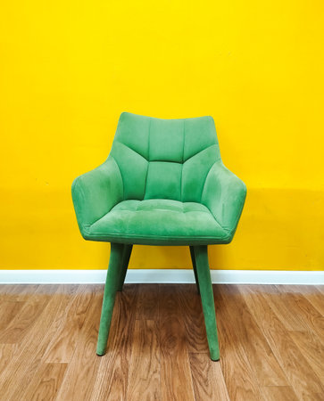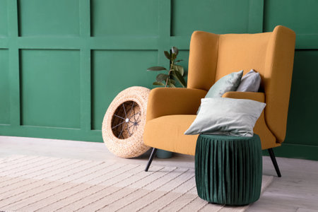 Yellow chair in a vintage room interior with green wall, stool, cabinet, teapot and plant
