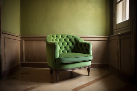 a green chair sitting in a corner of a room next to a window with a wooden floor and a green wall with a wooden trim. . generative ai