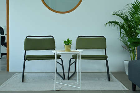 Photo of a comfortable corner for relaxation surrounded by chairs and a table over the cozy living room as a background.