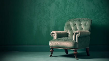 An eye catching illustration of Style loft interior with gray armchair on empty dark green wall background. Created using Generative AI tools.