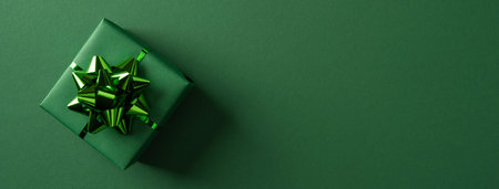 A green gift box with a glossy bow sits on a deep green banner background, conveying luck, Irish charm, and a festive greeting for St Patrick's Day celebration