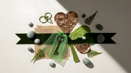 Easter decoration with eggs, green ribbon and key on white background