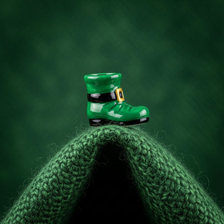 A tightly framed, perfectly symmetrical 1:1 close-up of a miniature emerald green velvet leprechaun
