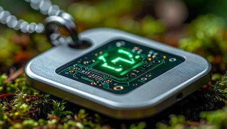 A futuristic digital tracker pendant, its green screen glowing with cryptic data, lies hidden on a soft bed of forest moss. This image blends advanced technology with the natural world, suggesting themes of survival, secret missions, or lost artifacts.