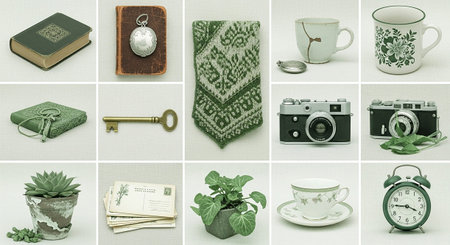 presents a grid of fifteen still life compositions featuring a variety of antique and vintage The dominant colors are shades of green and beige, with accents of white and metallic tones. Featured include old books, pocket watches, a knitted textile, ceramic teacups and mugs, keys, vintage cameras, a succulent plant in a pot, a stack of old postcards, and an alarm clock. The presentation is clean and organized, highlighting the textures and historical character of each