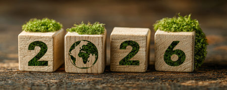 An eco friendly 2026 concept sustainable future climate hope green earth wooden block number moss detail closeup natural texture