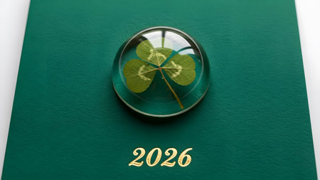 A green four leaf clover encased in glass sits on a green surface with the year 2026. Clear detai...
