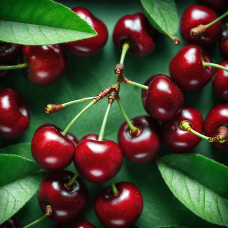 Fresh cherry fruits with green leaves. Healthy foods for arthritis and inflammatory pain. Generative AI