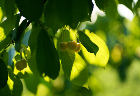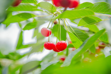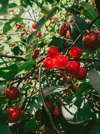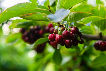 Cherry tree with red fruits growing in the garden, natural vintage seasonal background