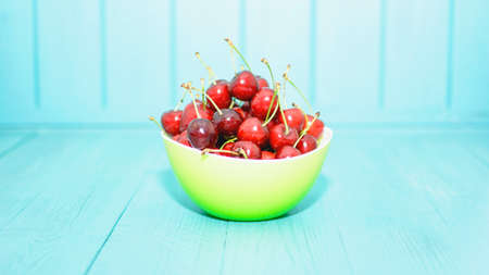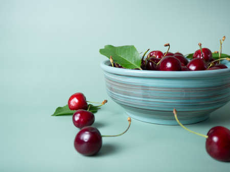 ripe cherries in a bowl on a menthol background with place for your text