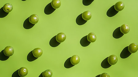 This image features a dynamic arrangement of green limes set against a bold green background. The vibrant colors and shadows create an artistic visual. Perfect for culinary or health themes.