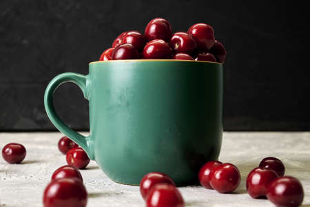 red ripe cherries in a teacup on the table
