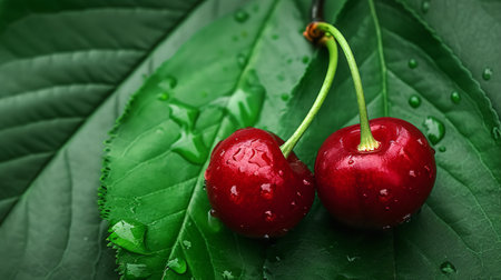 Red cherries on a green leaf. Very refreshing and tropical image
