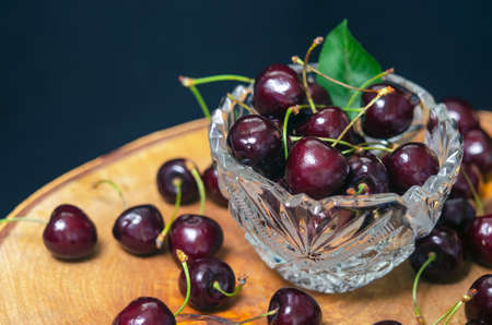 sweet cherry in a crystal vase on a birch board on a black background with a green leaf