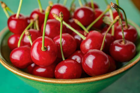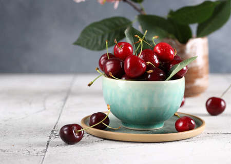 Many ripe cherries on a beautiful background in a plate