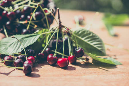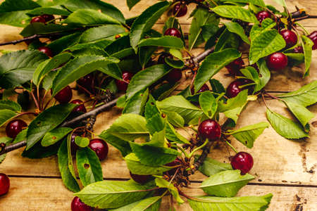 Ripe cherry on the branches. Fresh berries, healthy dessert. Old wood plank background