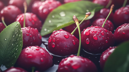 Fresh cherries glistening with water droplets among lush green leaves in a summery setting