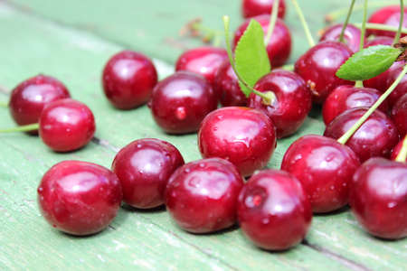 Juicy cherry on a wooden background. Red freshly picked cherry.