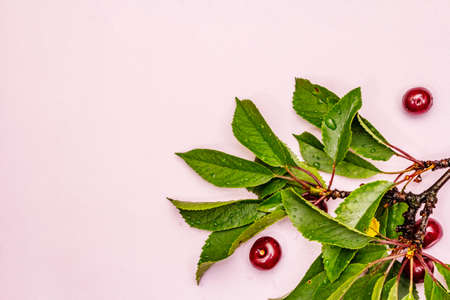 Ripe cherry on the branches. Fresh berries, healthy dessert. Gentle pink background