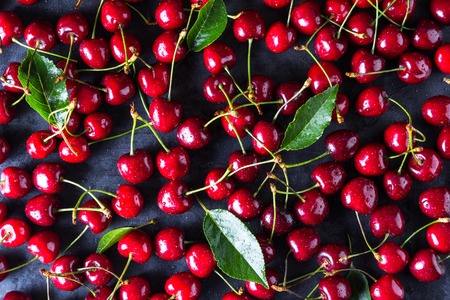 Fresh red ripe cherries on dark grey table. Top view, copy space