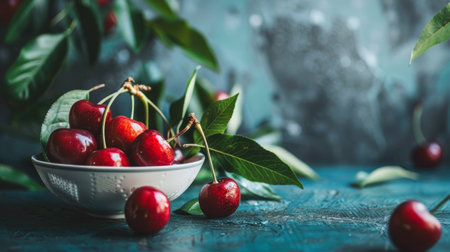 A bowl of fresh cherries placed on a textured teal background with green leaves, highlighting the vibrant colors and natural freshness of the fruit.
