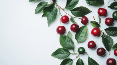 Close-up of plump cherries and green leaves, isolated on white, showcasing their juicy texture and vivid red hue