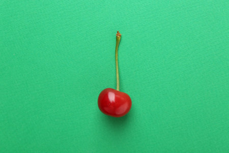Flat lay with red cherry on mint background, close up