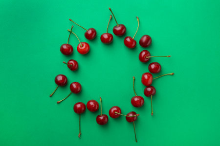 Fresh ripe cherry on green background, top view
