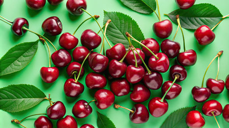 Bright red cherries with green leaves arranged neatly on a vibrant green surface.