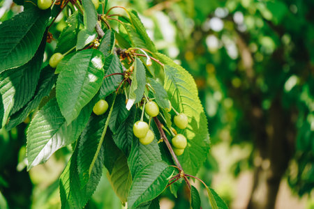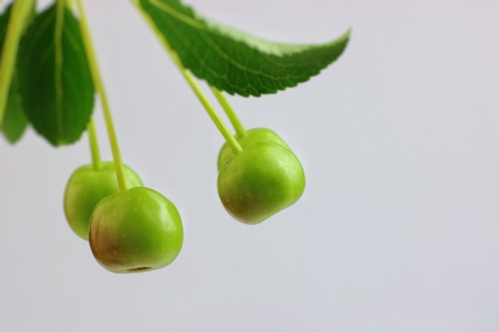 green cherry fruit closeup on a branch in the garden