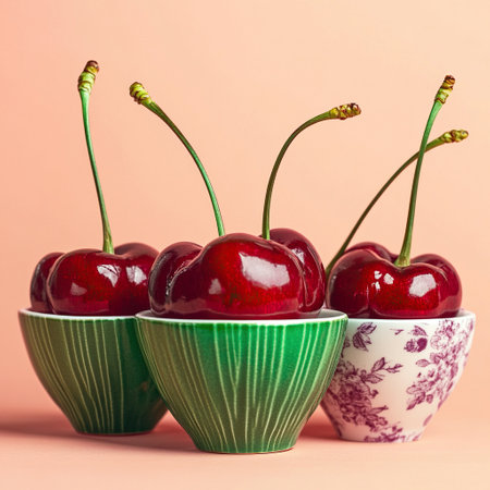 glossy red cherries with thin green stems, arranged in pairs, front angle view, bright reflective light, isolated on soft peach background --no shadow, people --chaos 12 --ar 1:1 --weird 150 --v 6.1 Job ID: 21a3fbbe-1e16-430d-a061-f63c01ffe1ca