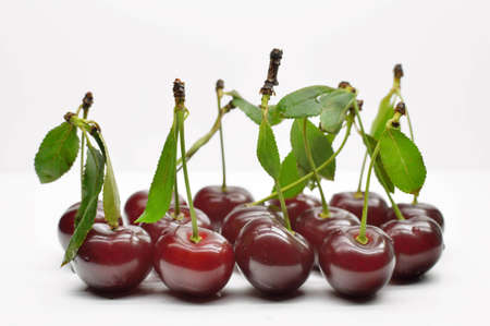 Cherries with leaves on white background, close-up