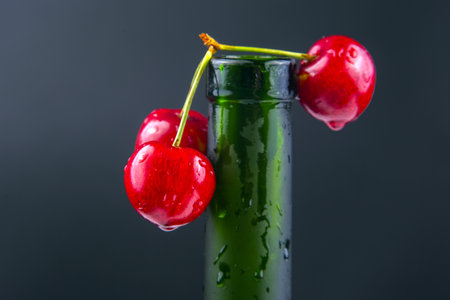 Bright red cherries are perched on the neck of a green glass bottle, with droplets of water adding a refreshing touch against a dark background that enhances the vivid colors.