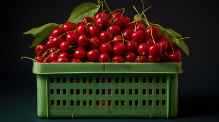 A Green Basket Filled With Red Cherries