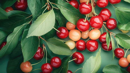 Discover the beauty of fresh cherries in vivid red and yellow hues, surrounded by lush green leaves, perfect for illustrating healthy living and nutrition.
