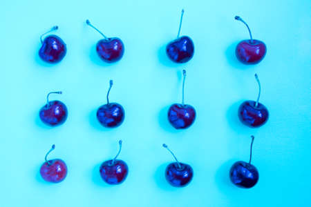 Neon bright blue cherry on a ultraviolet background. Cherry pattern. Cherries closeup. Summer flat lay berry background. Top view